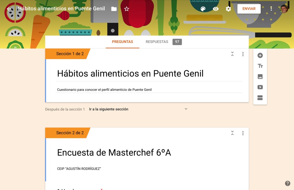 La tercera tarea del proyecto consistirá en analizar los hábitos nutricionales de nuestros vecinos y vecinas. Para ello, entre toda la clase y, mediante lluvia de ideas, elaboramos una encuesta mediante la herramienta formularios de google drive.